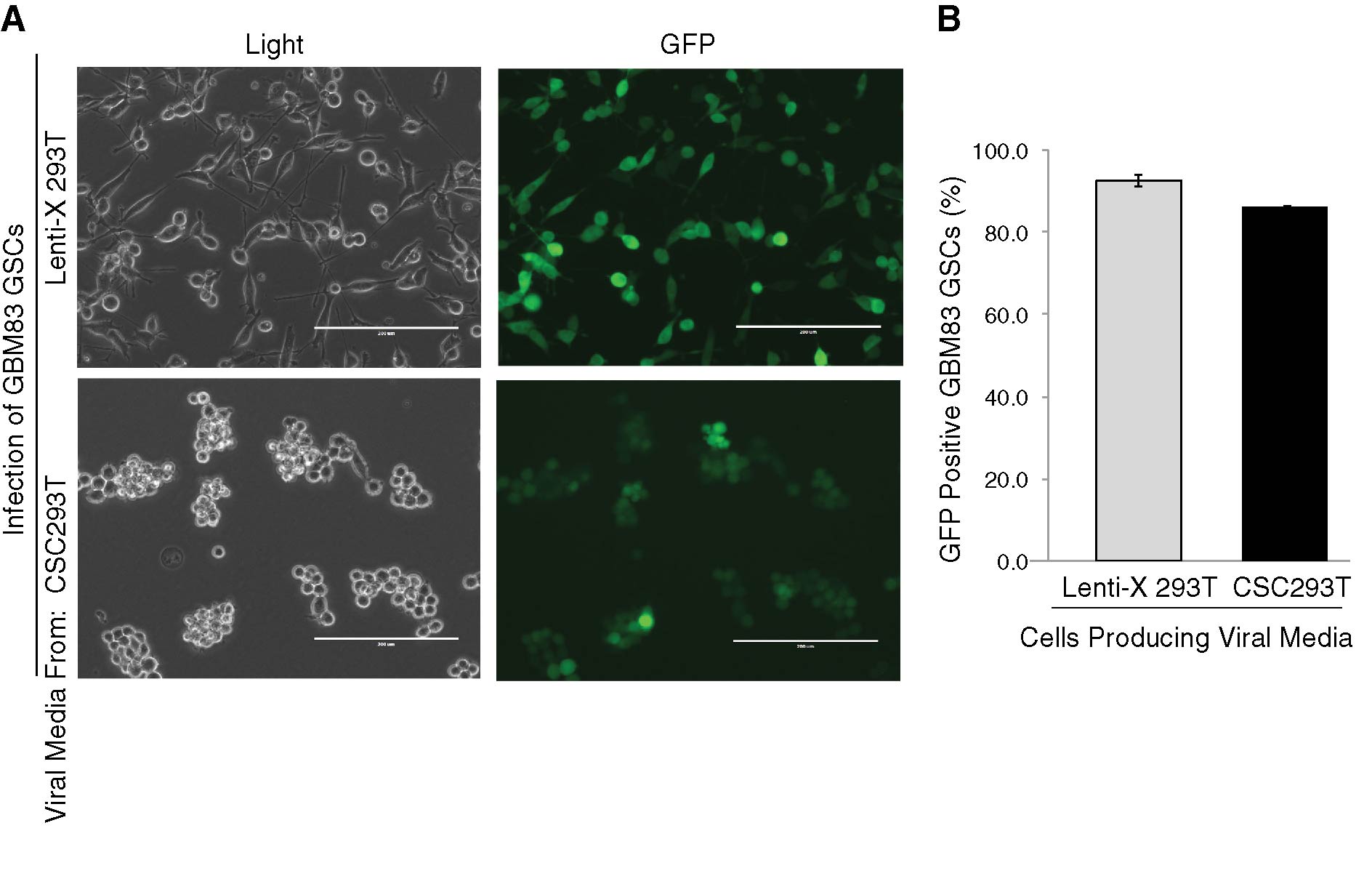 Figure 4. CSC293T Produce Virus Capable of Efficiently Infecting Cancer Stem Cells without Concentration. (A) Representative images under light and fluorescent microscopy of GBM83 CSCs 72 hours post infection are shown with the white bar representing 200 μm. CSCs were infected with GFP expressing virus containing media produced by Lenti-X 293Ts or CSC293Ts. (B) Quantification of the percentage of GFP positive GSCs 72 hours post infection is shown. |