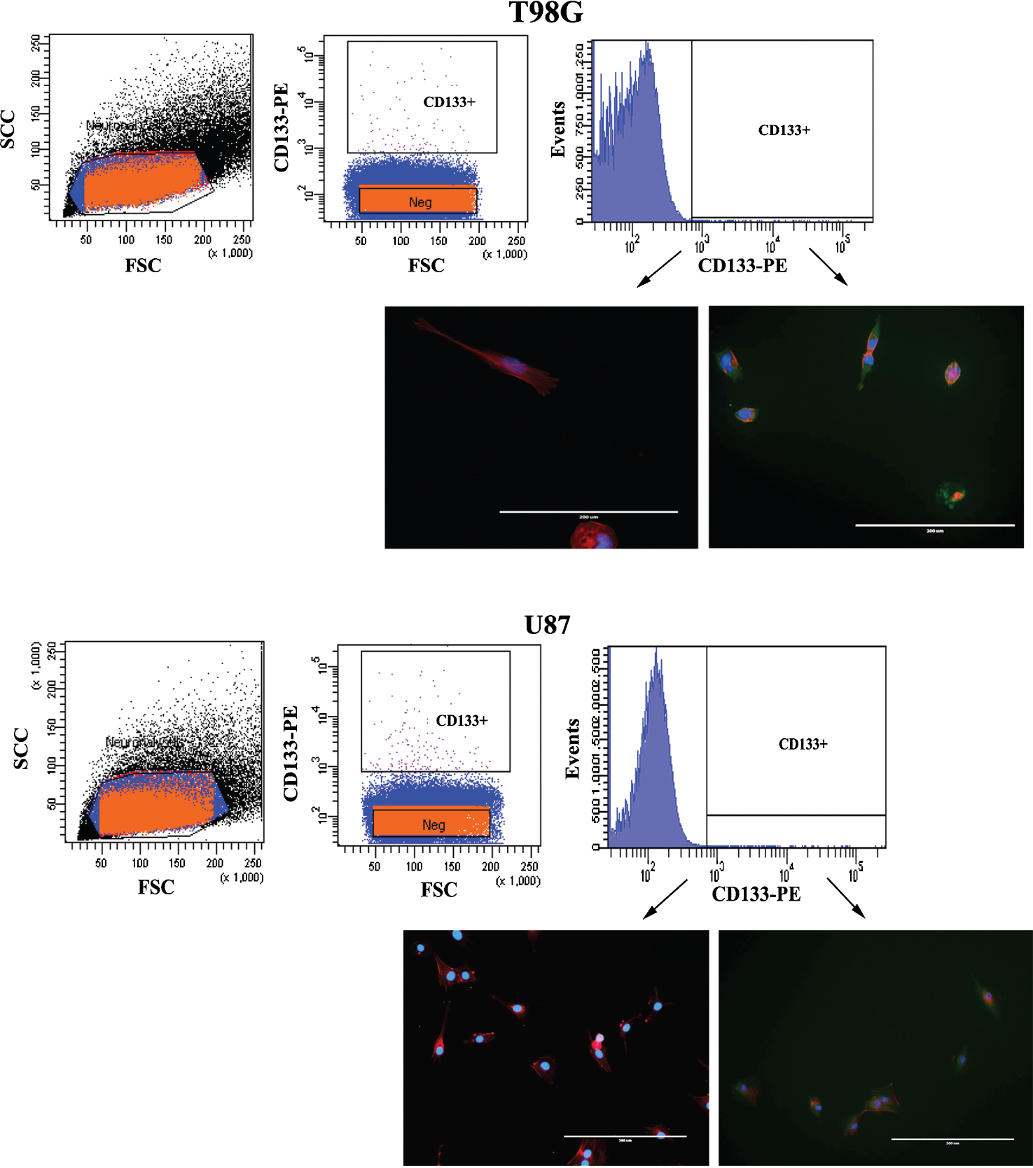 CD133 expressing GBM cells were positively selected from U87 and T98G cells by Fluorescent Activated Cell Sorting. The cells were labeled with PE-conjugated mouse anti-human CD133 (Miltenyi Biotec, Bergisch Gladbach, Germany). Positive and Negative cells were analyzed post-sort by Flow Cytometry to confirm purity.