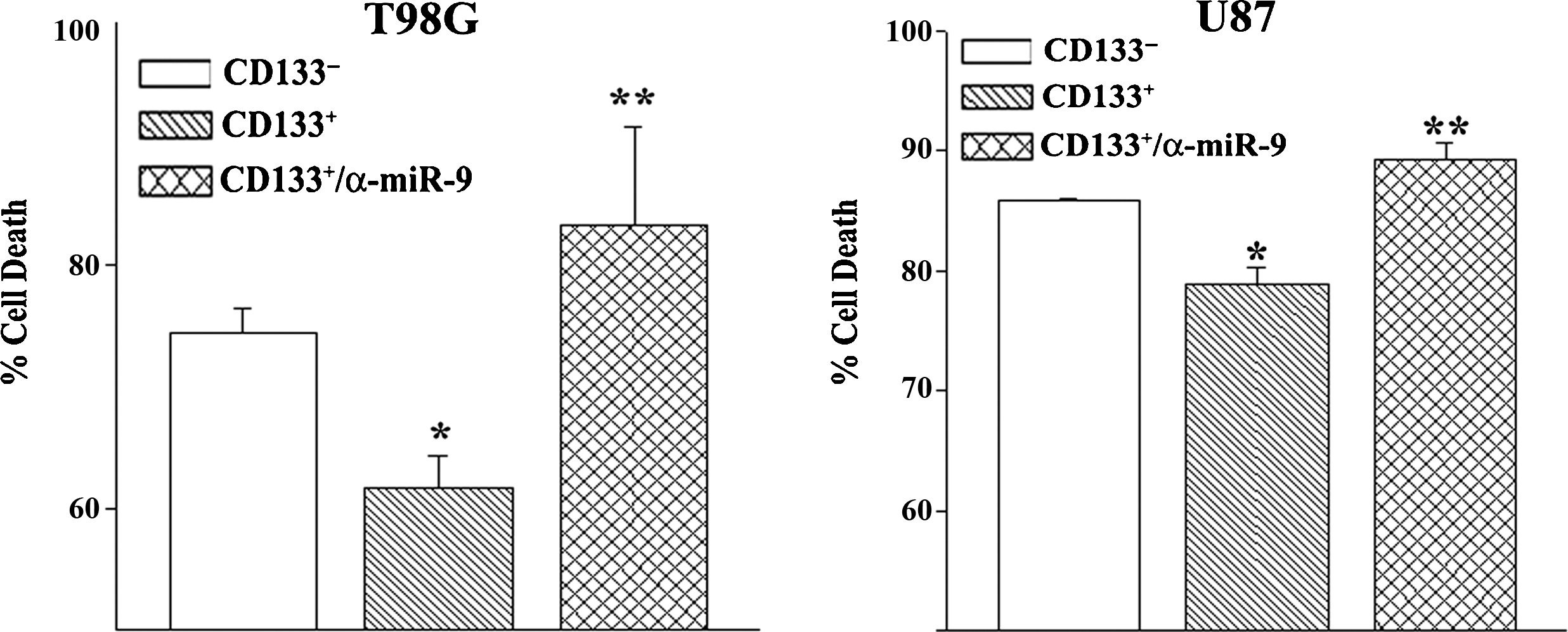 Figure 2. Resistance of CD133+ cells to TMZ. Sorted U87 and T98G cells were transfected with anti-miR-9 or untransfected. The cells were treated with 200 μM TMZ. After 72 h, cell viability was assayed by CytoTox 96® LDH release. The results are presented as % cell death ±SD, n = 4. *p < 0.05 vs. CD133− cells. ** p > 0.05 vs. untransfected CD133+ cells. |