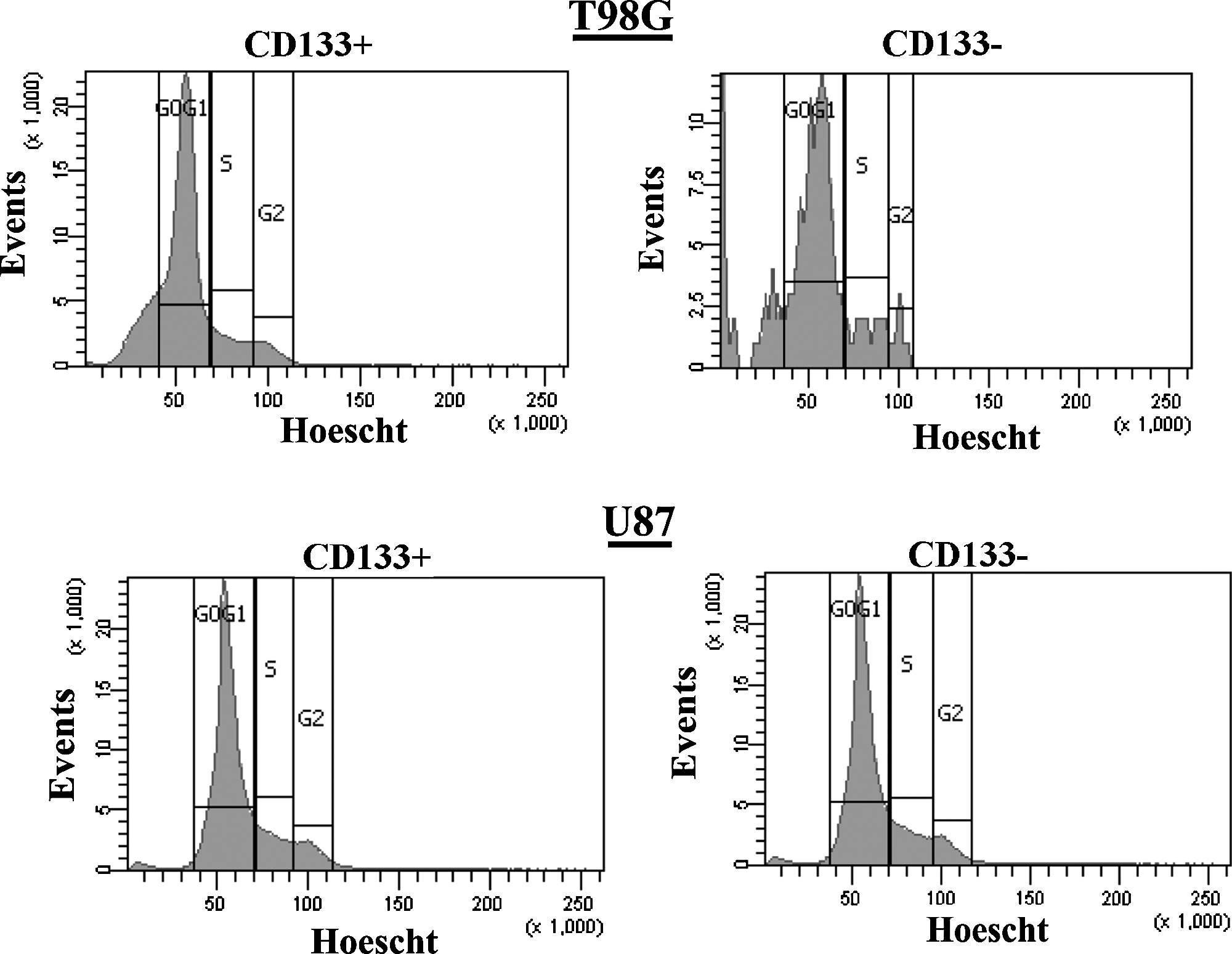 Since CD133+ cells have been reported to be the CSCs of GBM, it is expected that these cells would be in cycling quiescence [22]. We therefore asked if the resistance of TMZ could be explained by the slow cycling of CD133+ GBM cells. To address this question we asked if there are differences in the cell cycle status between CD133+ and CD133− cells. We labeled U87 and T98G cells with PE-conjugated anti-CD133-PE and Hoechst dye and then analyzed the cells on the FACS analyzer. The results showed similarities in the cycling status of both CD133− and CD133+ subsets (Figure 3). This suggested that the chemoresistant properties of CD133+ cells could not be explained by changes in cell cycling.