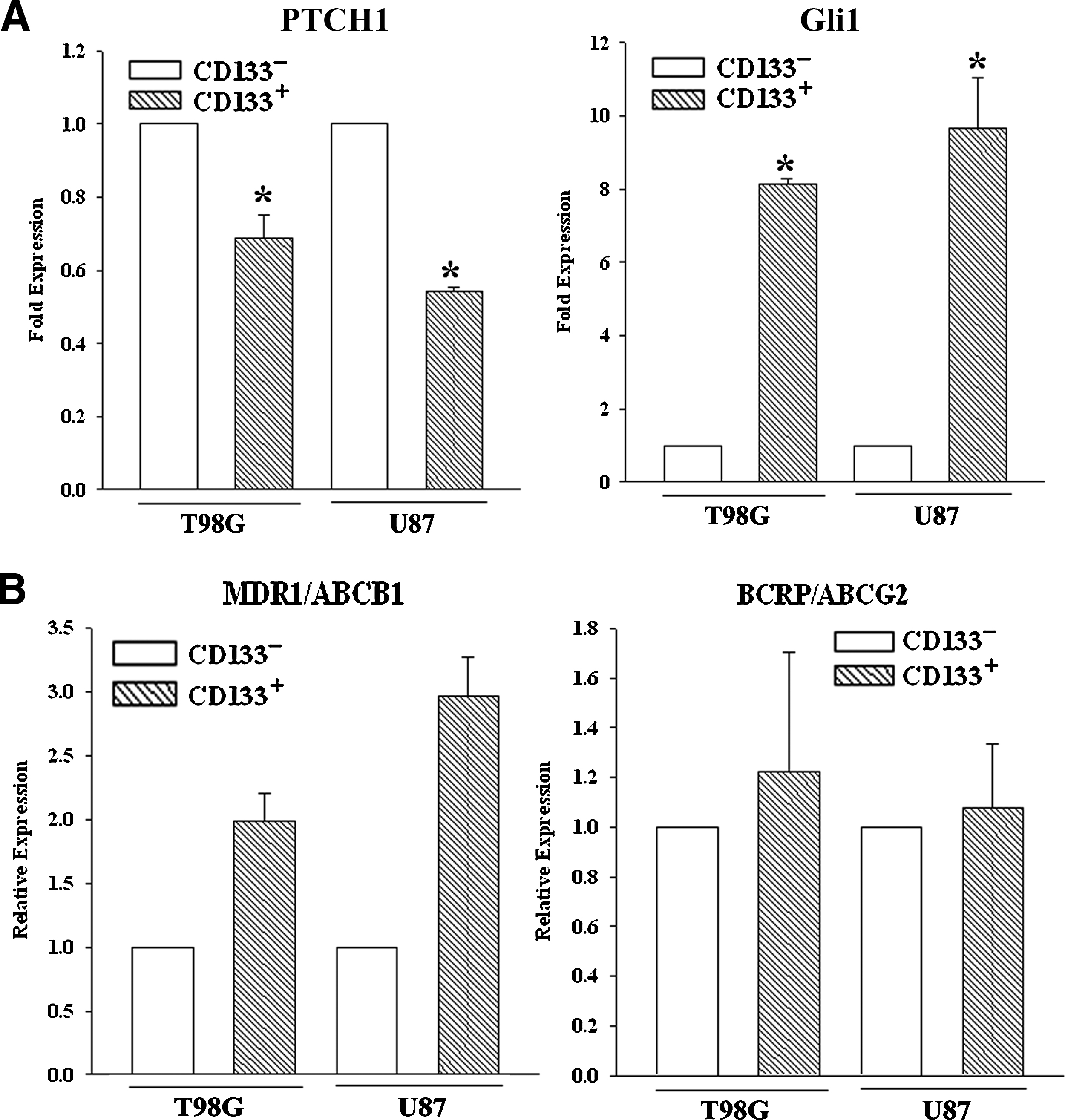 Figure 4. SHH signaling and ABC transporter in CD133+ cells. CD133+ sorted U87 and T98G cells were analyzed by real time PCR for Gli1 and PTCH1 (A) and, the ABC transporters, MDR1 and ACBG2 (B). |
