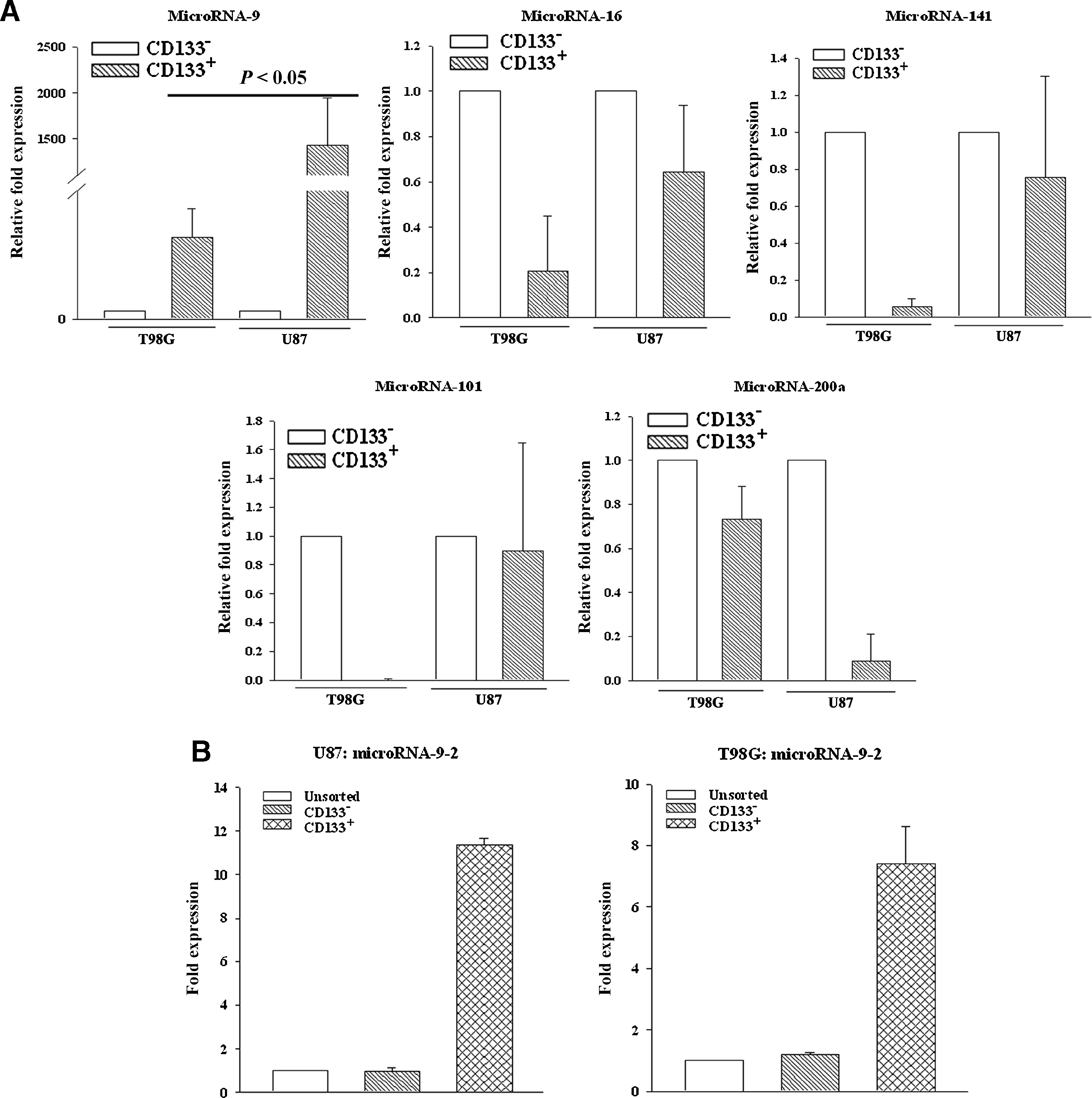 Figure 5. MiR-9-2 level in CD133+ cells from GBM. CD133+ cells were sorted. MiRNA was isolated and then analyzed by Taqman® miRNA qPCR for the predicted PTCH1 targeted miRNA (A). Real time was performed for miR-9-2 (B). The results are shown as the fold change from unsorted GBM cells, ±SD, n = 4. |