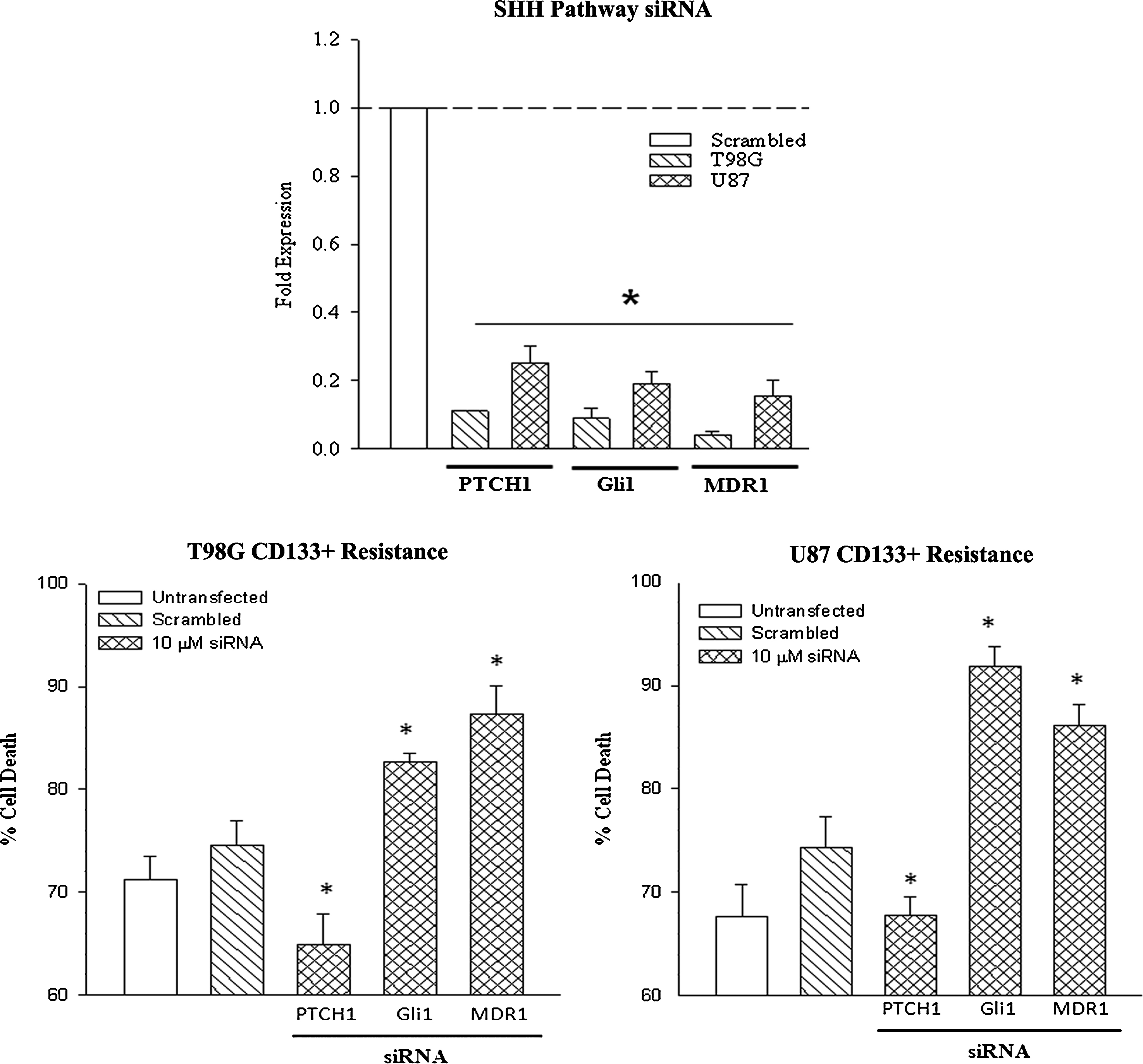 In this set of studies, we investigated the relevance of SHH pathway and MDR1 in the chemoresistance in CD133+ cells. We knocked down PTCH1, Gli1 and MDR1 with targeted siRNA or scrambled siRNA. Knockdown was confirmed by real-time PCR for each gene (Figure 6, top panel). Next, we treated the knockdown CD133+ cells with 200 μM TMZ. After 72 h, the viability of the cells was studied with Cell Titer Blue. Here we show that knockdown of PTCH enhanced resistance to TMZ, while Gli1 and MDR1 knockdown sensitized the cells to TMZ.